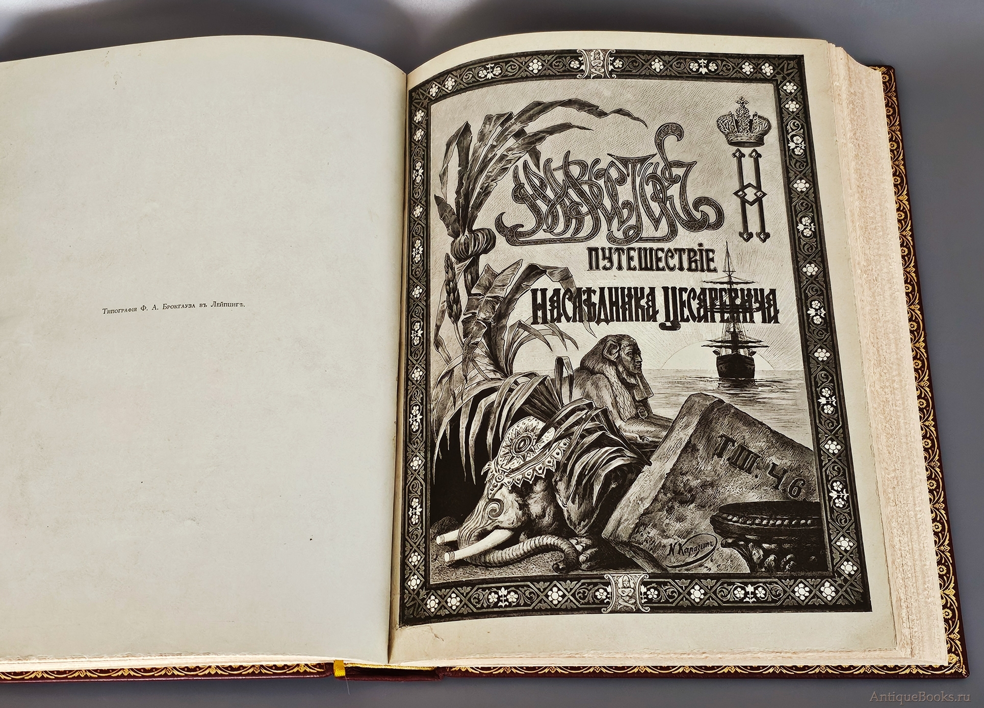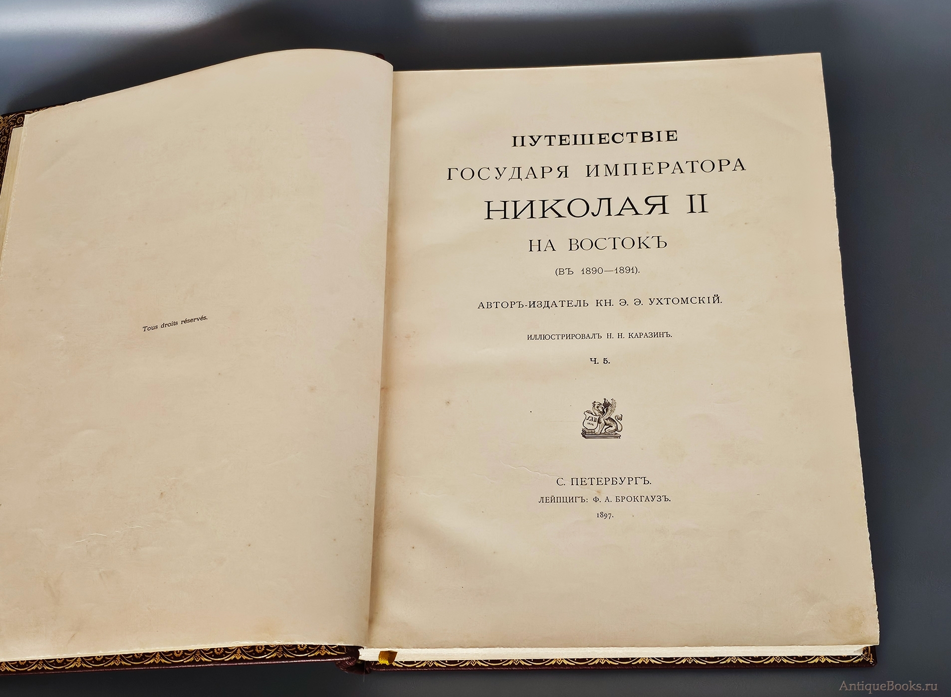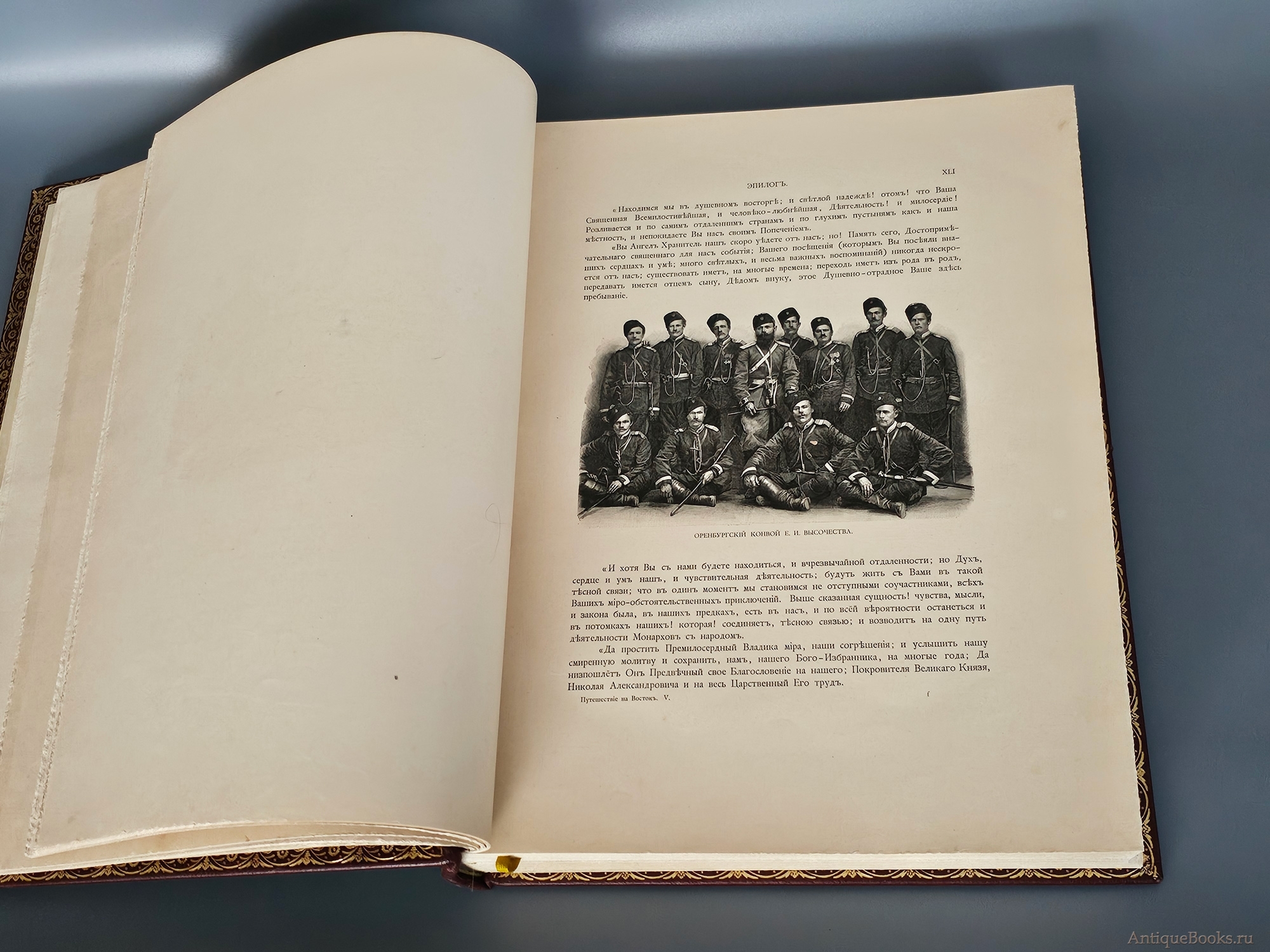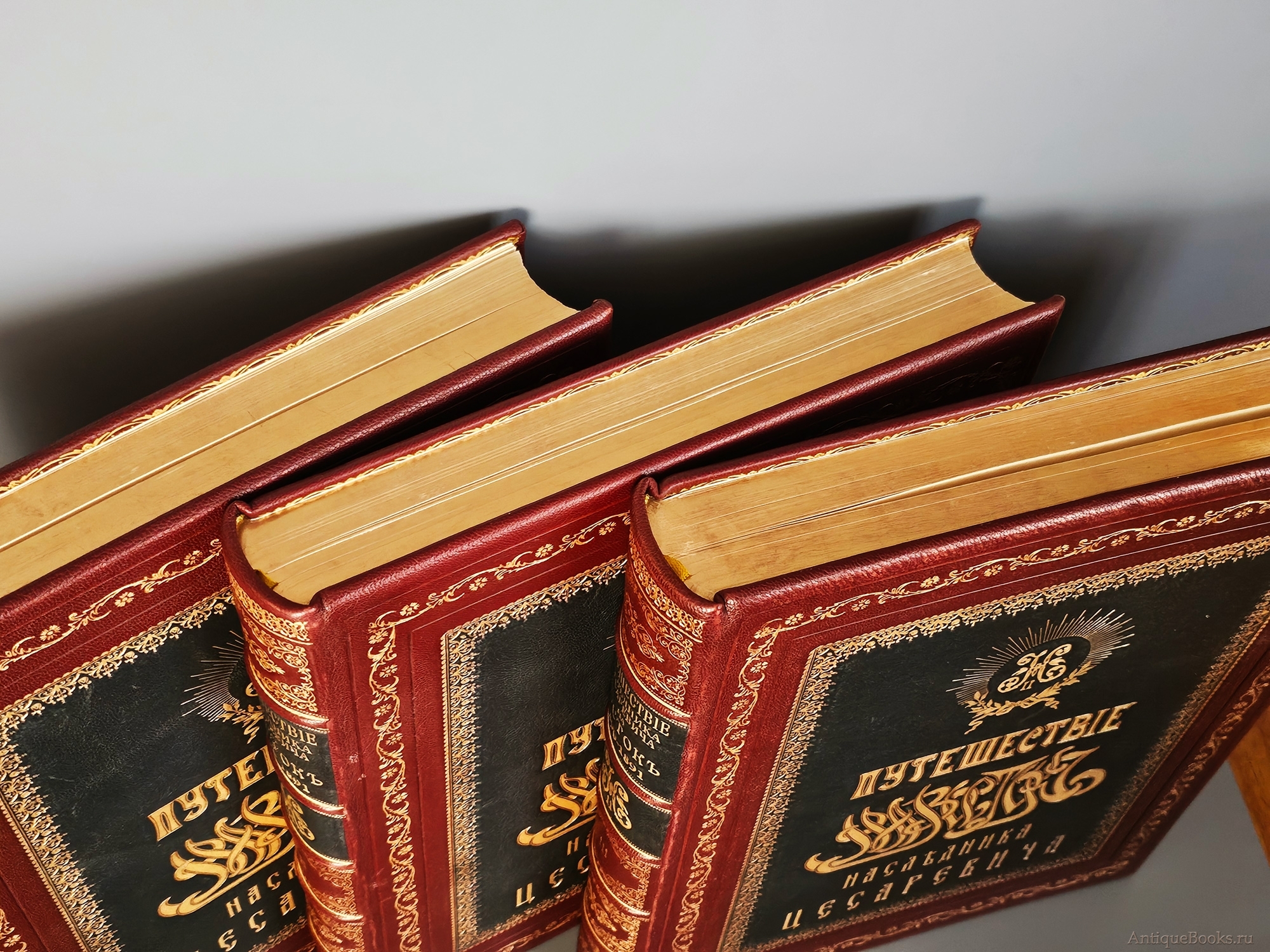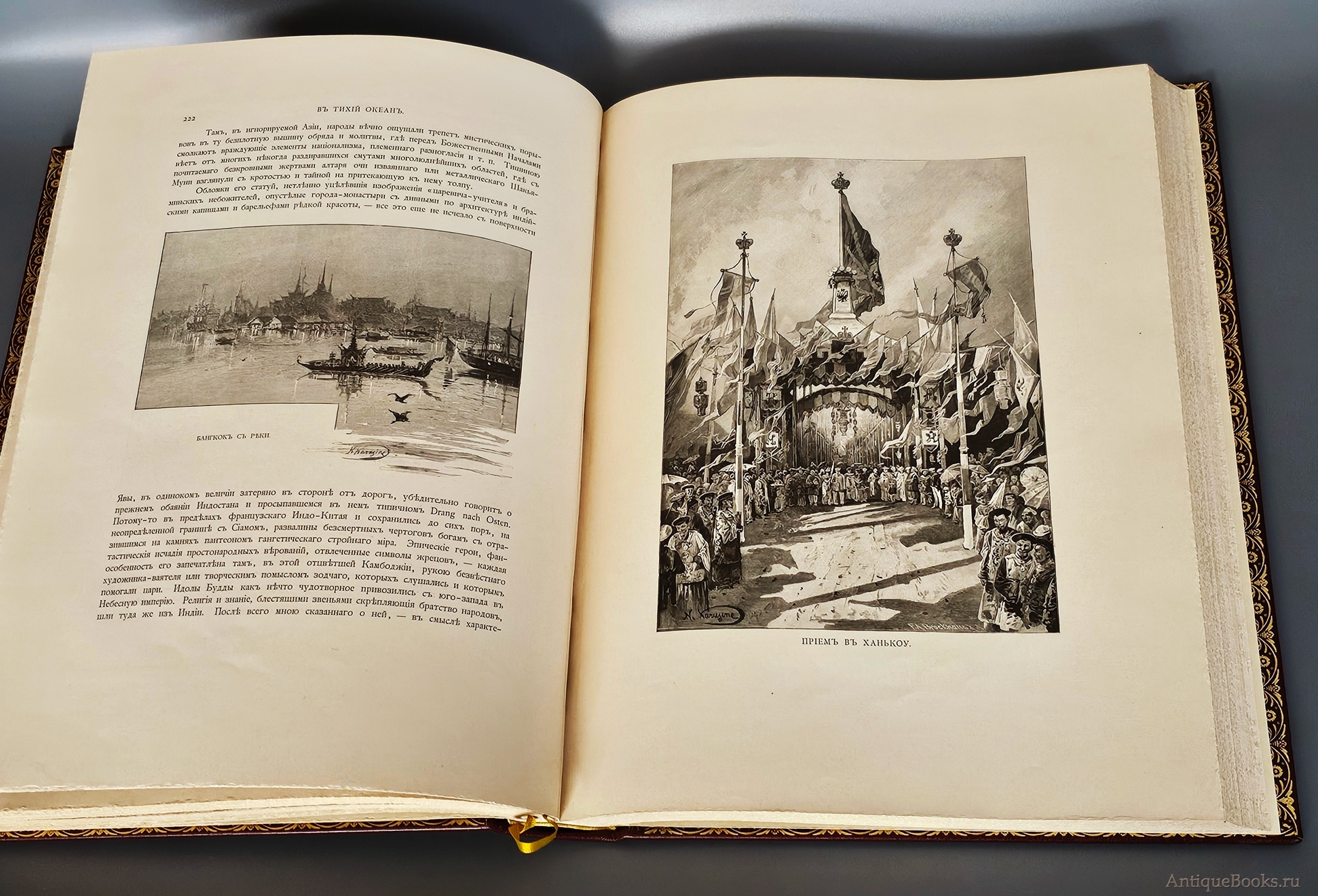 Роскошное издание, посвященное путешествию Цесаревича Николая (будущего Императора Николая II) на Восток, которое продолжалось с 23 октября 1890 г. по 4 августа 1891 г.: это путешествие задумывалось как заключительный этап образования наследника российского императора, одновременно являясь важнейшим дипломатическим шагом со стороны императора-отца. Э. Ухтомский, издавший подробное описание этого путешествия, сопровождал наследника среди прочих членов его свиты. Первый том "Путешествия" вышел в свет в 1893 году, второй и третий тома - в 1895 и 1897 гг. И немедленно после этого книга была переведена на английский, немецкий и французский. Помимо занимательных описаний увиденных мест, произошедших во время путешествия событий и встреч, а также ценнейших сведений по истории и культуре восточных народов - наследник со свитой посетил Египет, Индию, Сиам, Китай и Японию, - книга замечательна и многочисленными иллюстрациями, выполненными Н.Н. Каразиным, знаменитым художником, получившим прозвание "русский Доре". В книге более 700 иллюстраций Н.Н.Каразина - многочисленные текстовые и полностраничные рисунки.