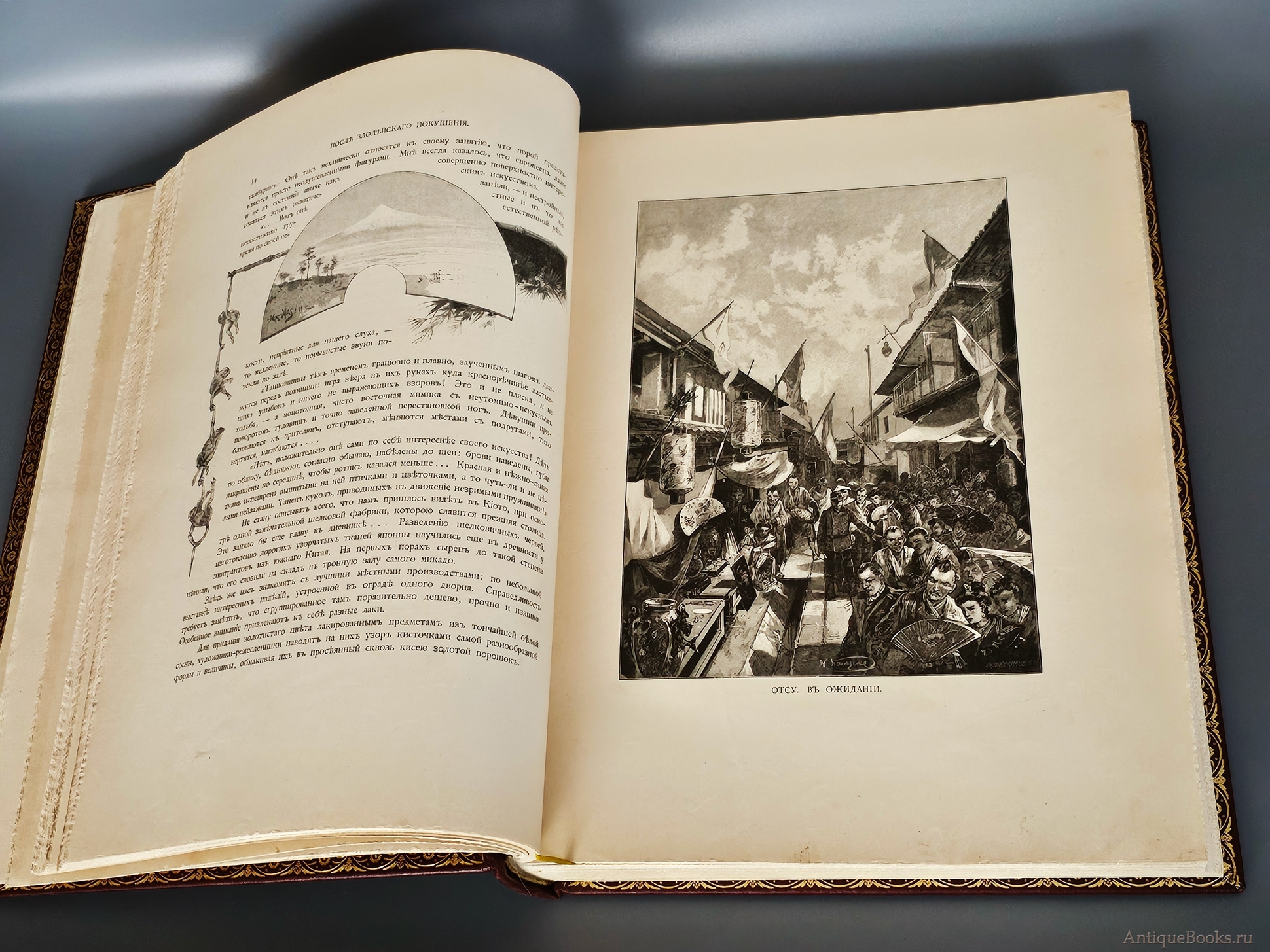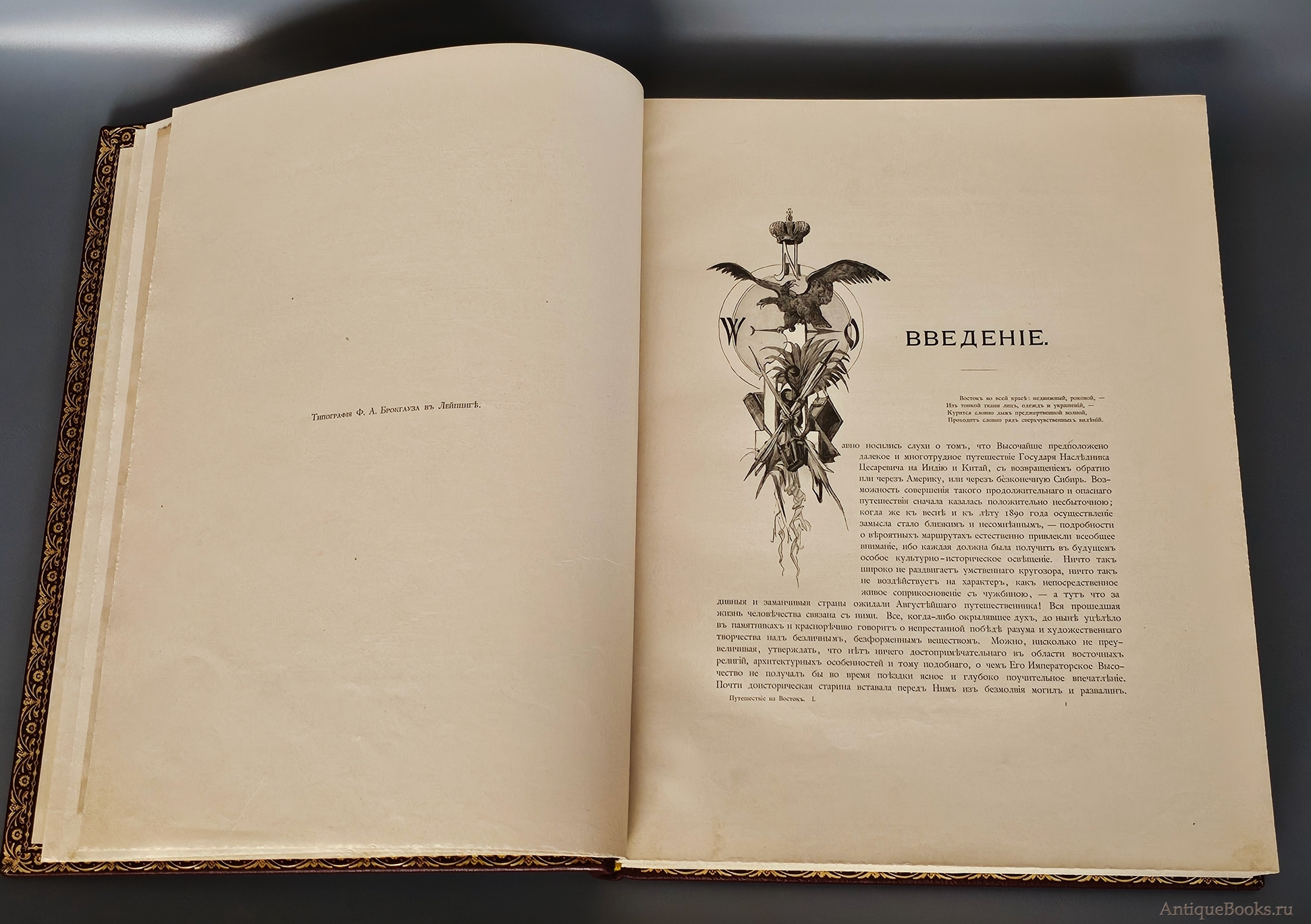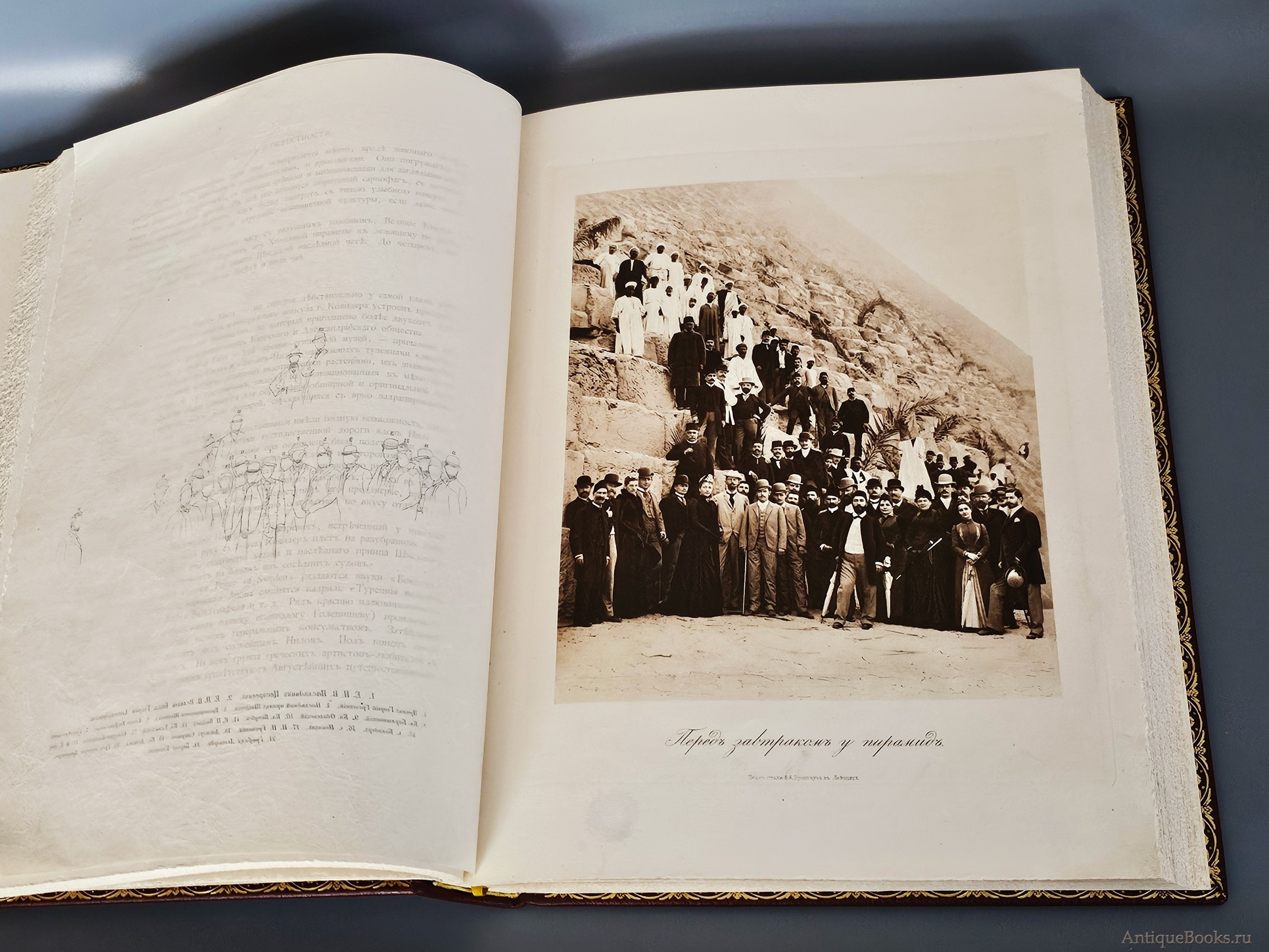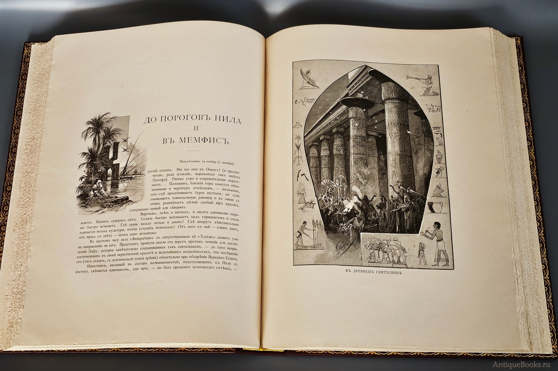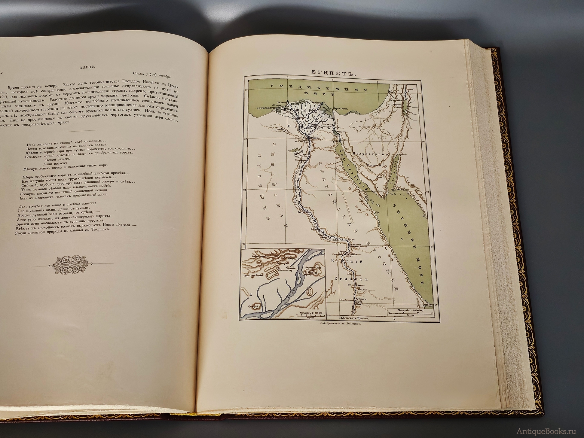 Роскошное издание, посвященное путешествию Цесаревича Николая (будущего Императора Николая II) на Восток, которое продолжалось с 23 октября 1890 г. по 4 августа 1891 г.: это путешествие задумывалось как заключительный этап образования наследника российского императора, одновременно являясь важнейшим дипломатическим шагом со стороны императора-отца. Э. Ухтомский, издавший подробное описание этого путешествия, сопровождал наследника среди прочих членов его свиты. Первый том "Путешествия" вышел в свет в 1893 году, второй и третий тома - в 1895 и 1897 гг. И немедленно после этого книга была переведена на английский, немецкий и французский. Помимо занимательных описаний увиденных мест, произошедших во время путешествия событий и встреч, а также ценнейших сведений по истории и культуре восточных народов - наследник со свитой посетил Египет, Индию, Сиам, Китай и Японию, - книга замечательна и многочисленными иллюстрациями, выполненными Н.Н. Каразиным, знаменитым художником, получившим прозвание "русский Доре". В книге более 700 иллюстраций Н.Н.Каразина - многочисленные текстовые и полностраничные рисунки.