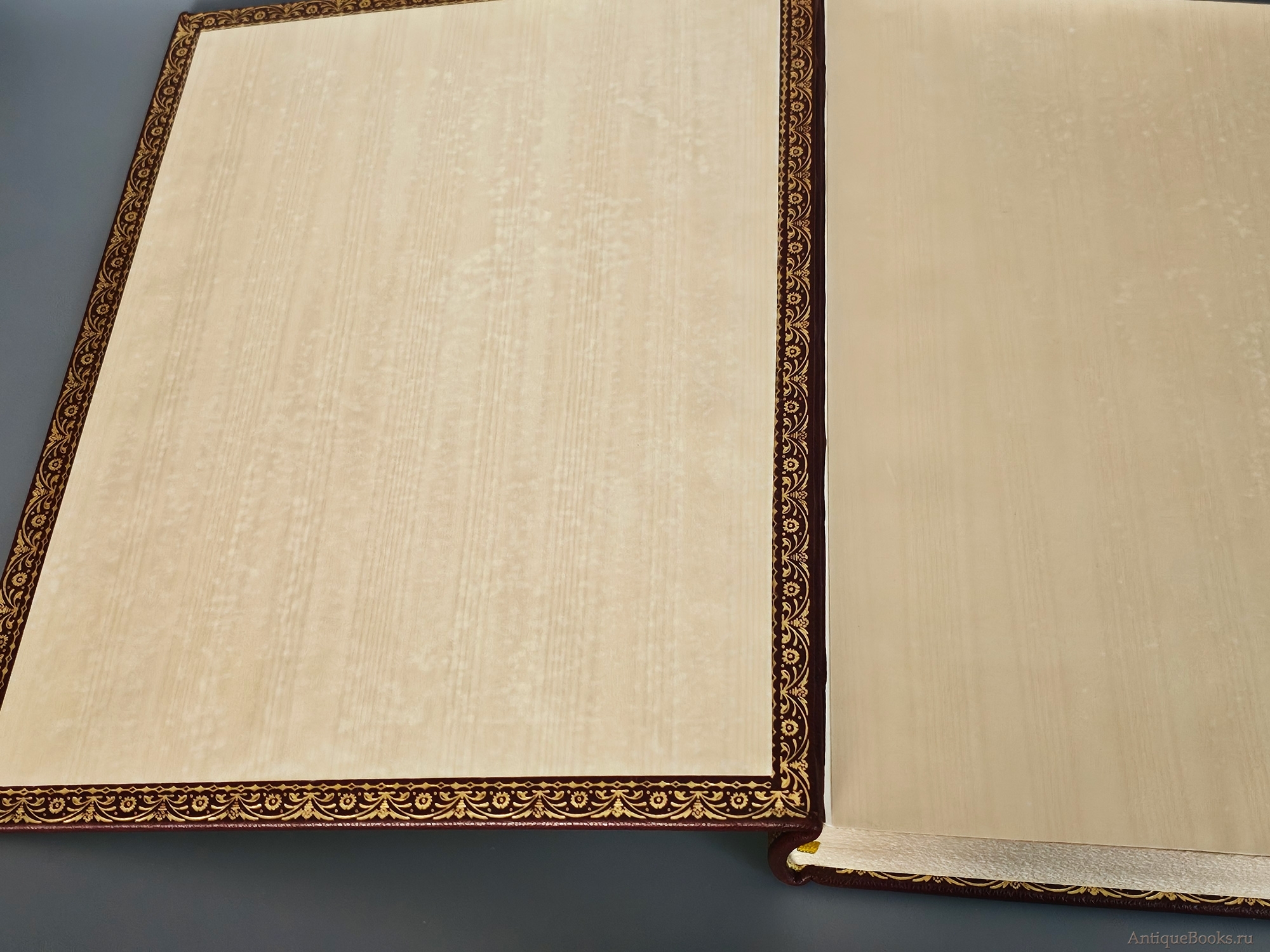 В трёх роскошных современных переплетах с инкрустацией из разных видов кожи. Художественное оформление переплетов. Золотой обрез. Муаровые форзацы с золотой дублюрой. Богато иллюстрированное издание. Полный комплект. Большой формат (фолио): 39x30 см. Состояние отличное.