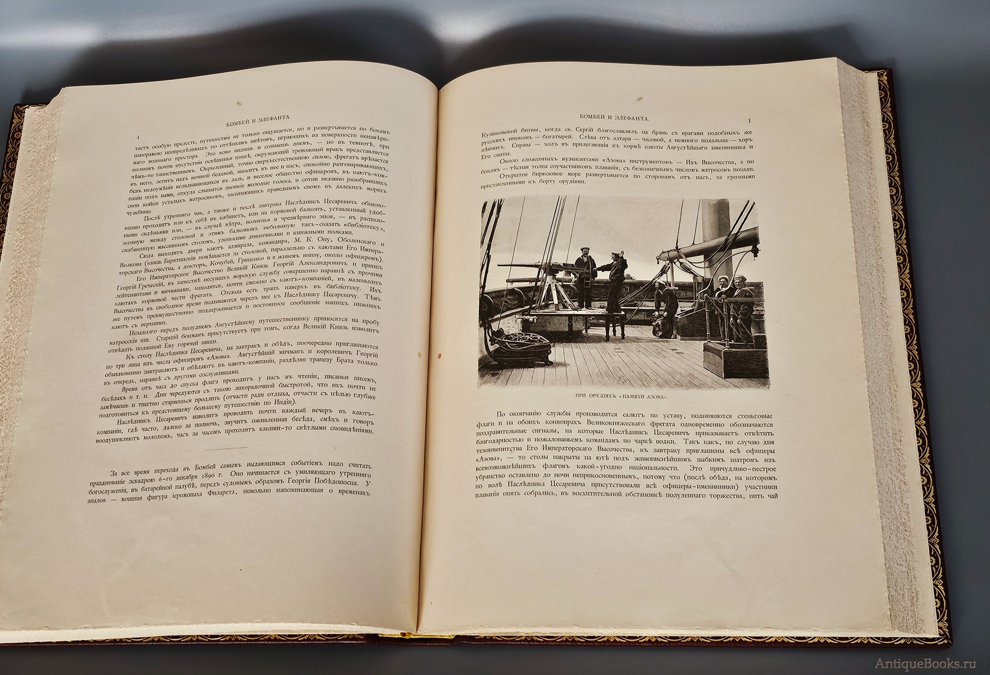 Художественное оформление кожаных переплетов - образец современного переплетного искусства. Шагреневая кожа. На передней крышке, украшенной арабесковым орнаментом, высокохудожественным тиснением, изображена историческая композиция по рисунку художника Н.Н.Каразина: к берегам Востока, с лежащим на земле мифическим и невозмутимым сфинксом, на закате приближается броненосный фрегат " Память Азова " с наследником Российского престола Цесаревичем Николаем Александровичем, будущим Императором Николаем II. Над композицией надпись названия книги и золототиснёный великокняжеский вензель, внизу в виде петроглифа на камне указан порядковый номер тома. Муаровые форзацы цвета шампань. Широкие золототисненые дублюры. Тройной золотой обрез.