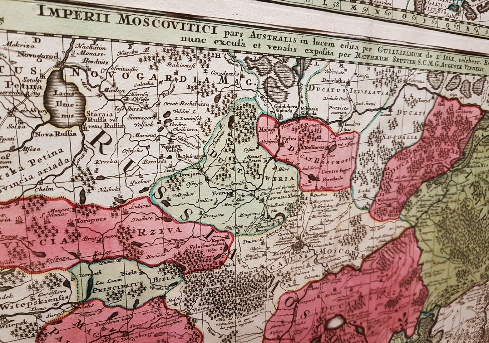 Карта выполнена картографом Matthaus Seutter в 1730 г.. Украшена декоративным гравированным картушем с названием карты на латыни. С акварельной раскраской от руки. Раскраской выделены княжества Европейской России, а также границы княжеств и государств. Карта подробная, для своего времени содержит очень большое количество географических названий. На карте обозначены границы земель, провинций, княжеств, города, народы, леса, реки, горы, моря и озера, важнейшие дороги.
