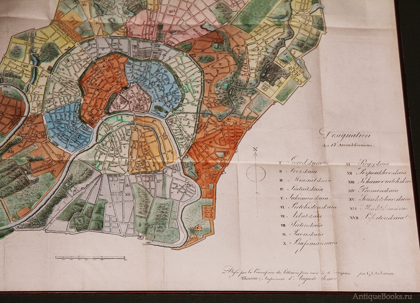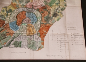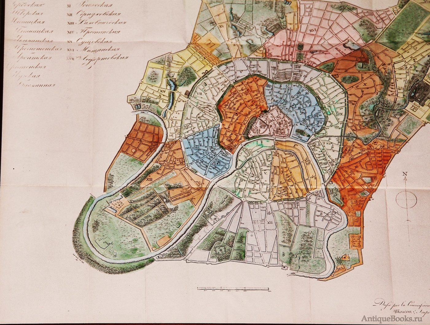 Большая литографированная карта с цветной акварельной подкраской работы Ф. Кайфер (F. Kaifer). На карте указано: «начертанный Комиссией строений для книги „Путеводитель в Москве“». Город состоял из 20 частей: Городская, Тверская, Мясницкая, Якиманская, Пречистенская, Арбатская, Сретенская. Яузская, Басманная, Рогожская, Таганская, Серпуховская, Хамовническая, Новинская, Пресненская, Сущевская, Мещанская, Покровская и Лефортовская.