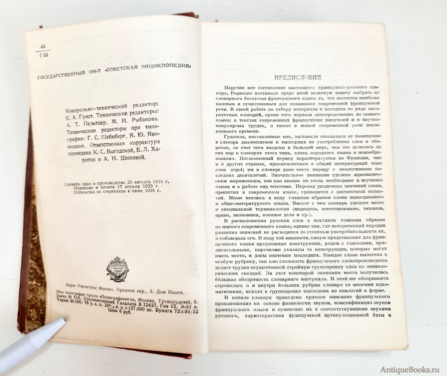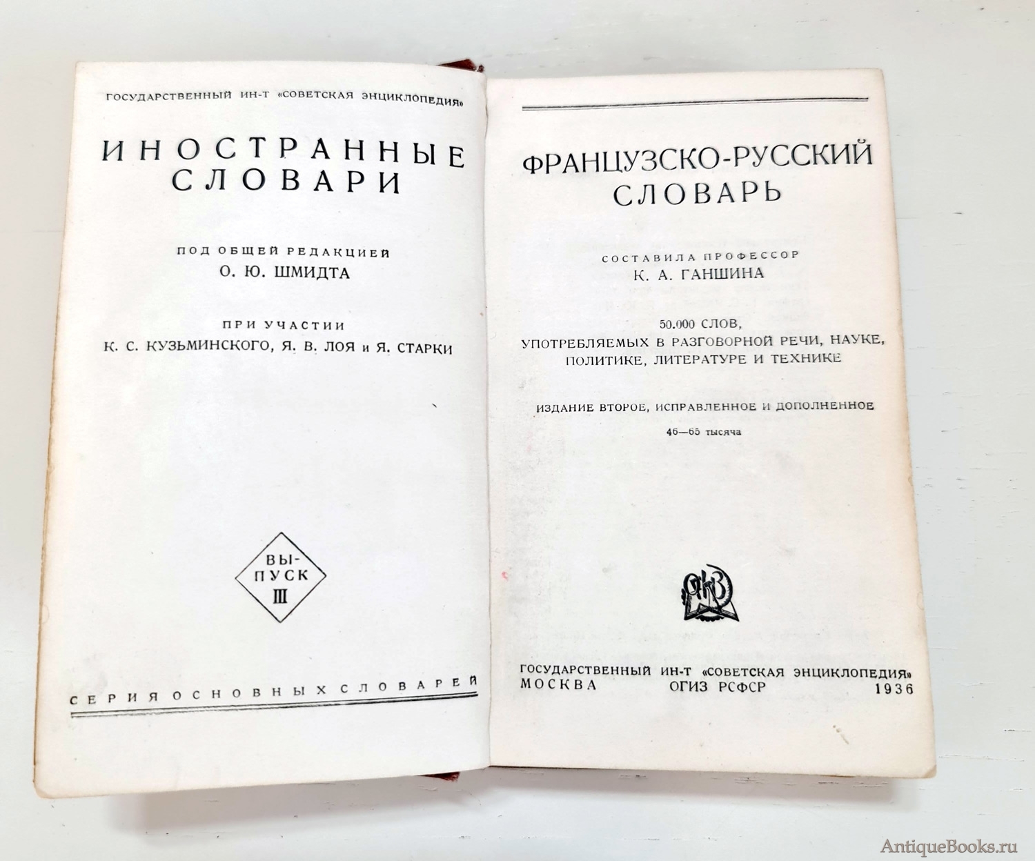 Фотографии предлагаемого издания "Два Французско-русских словаря". Клавдия Александровна Ганшина. Москва, Государственный научный институт Советская энциклопедия, 1936 г.