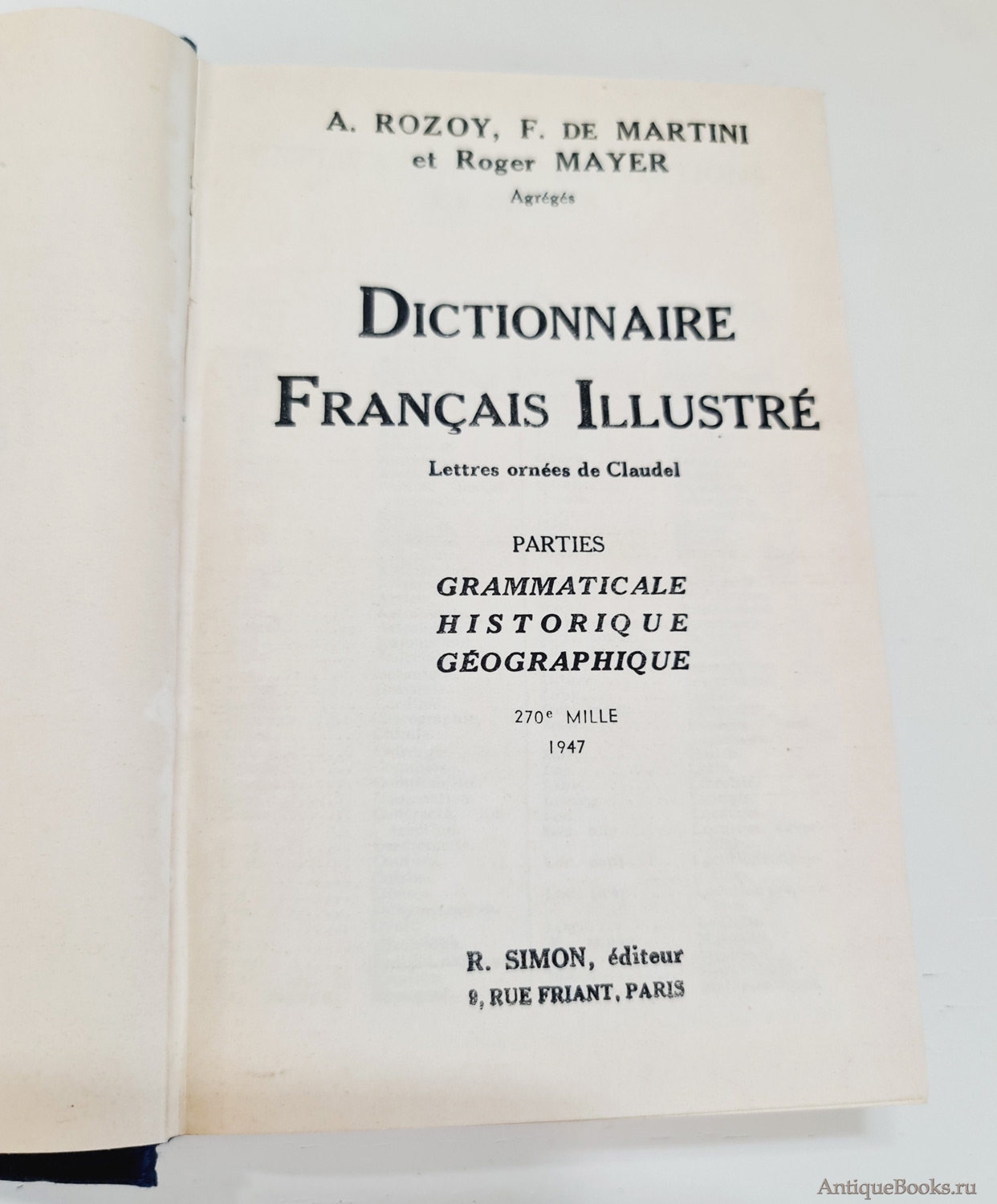 Фотографии предлагаемого издания "Иллюстрированный французский словарь Клоделя: грамматическая, историческая, географическая части. (Dictionnaire français illustré: Lettres ornées de Claudel: Parties grammaticale, historique, géographique". A.Rozoy, Mayer Roger. Paris, R.Simon, 1947