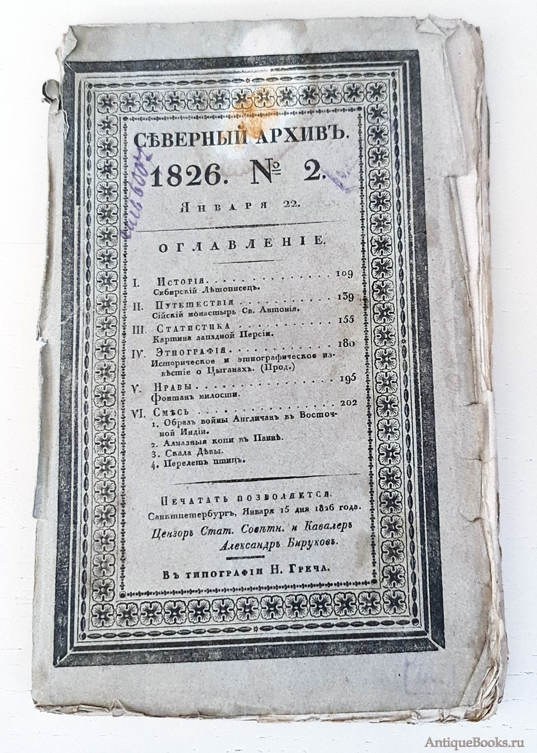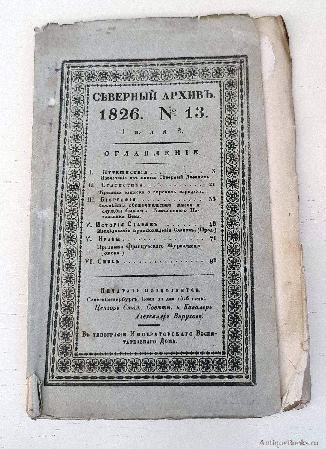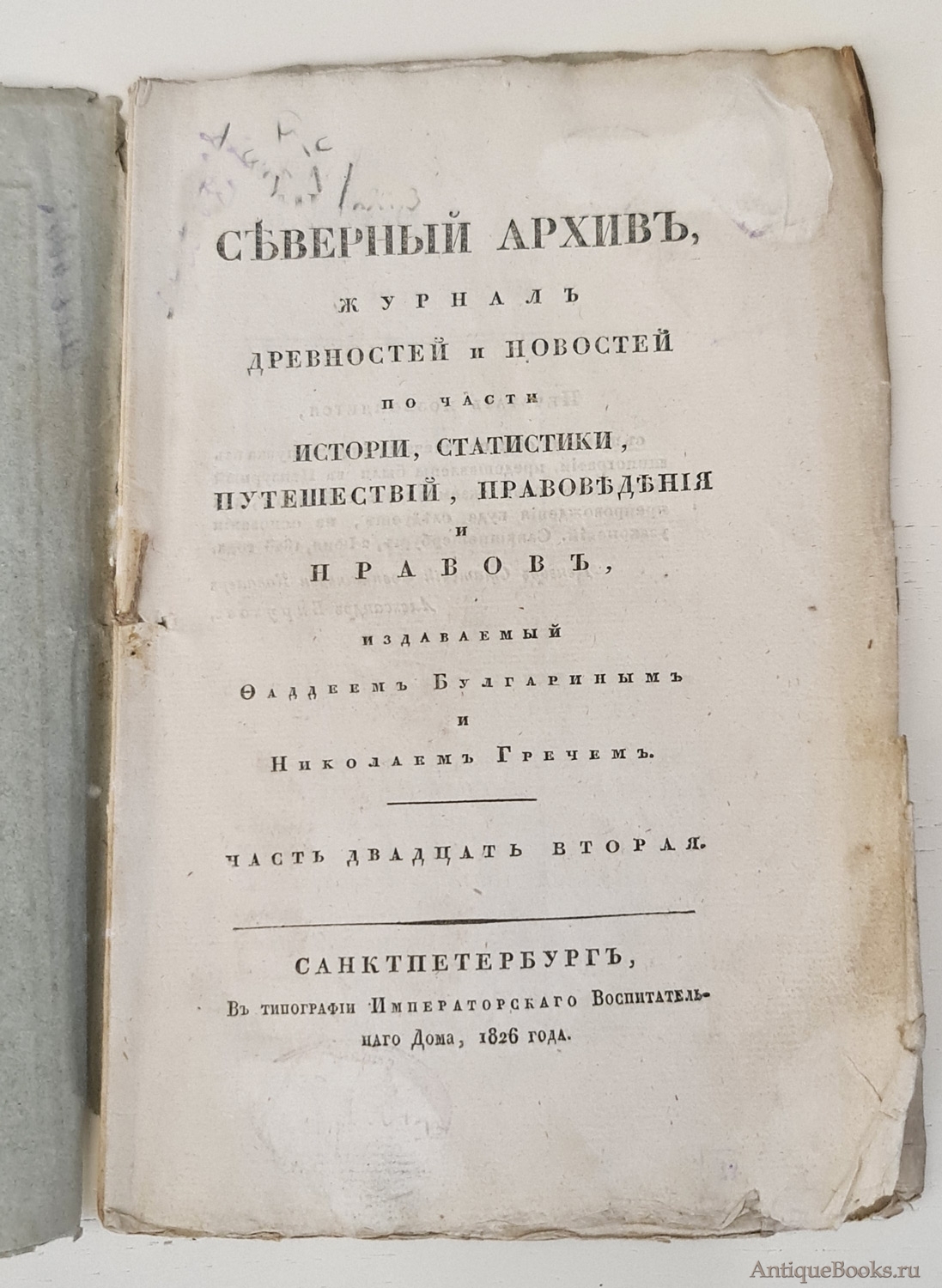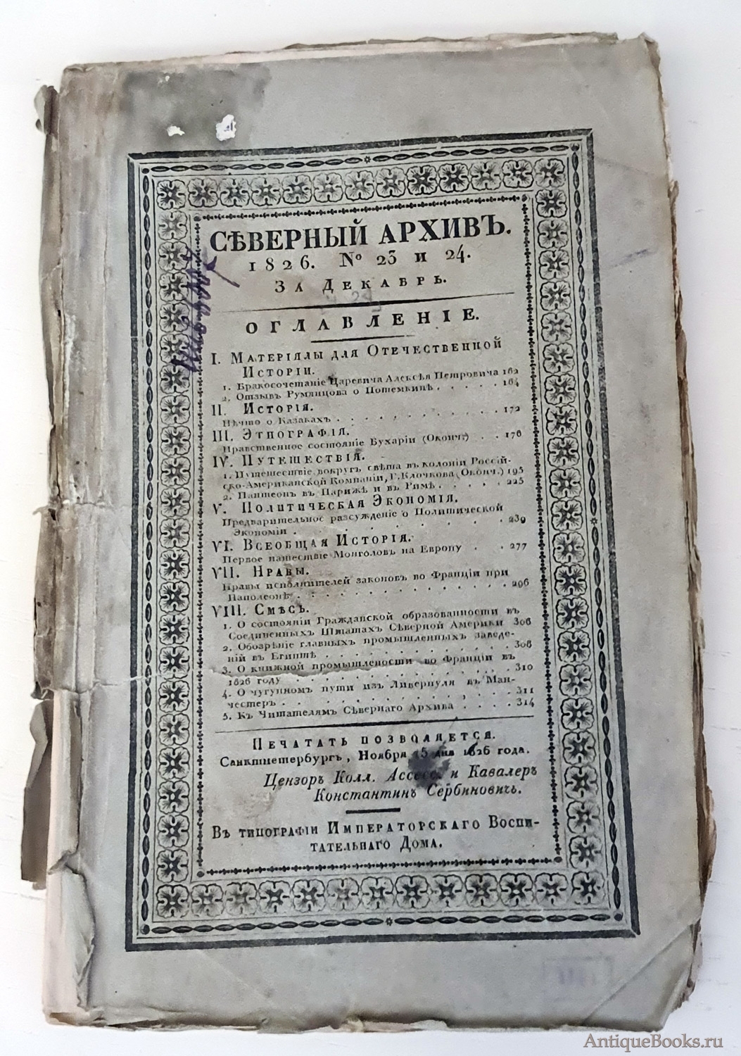"Северный архив 1826 год. № 1, 2, 11, 13, 23 и 24" Санктпетербург, В Типографии Императорского Воспитательного Дома, 1826 г.