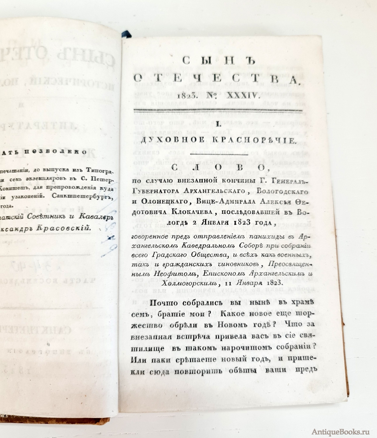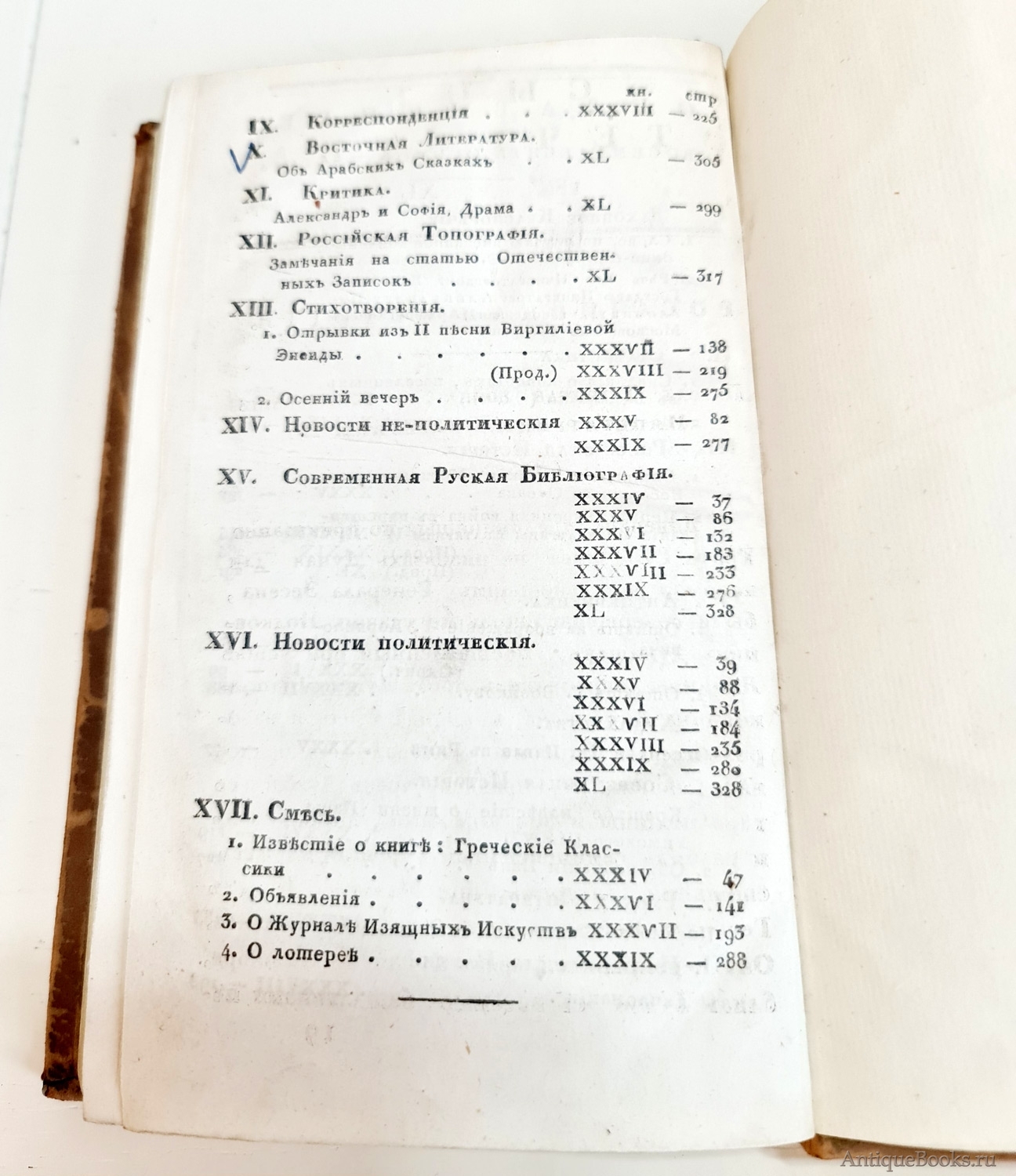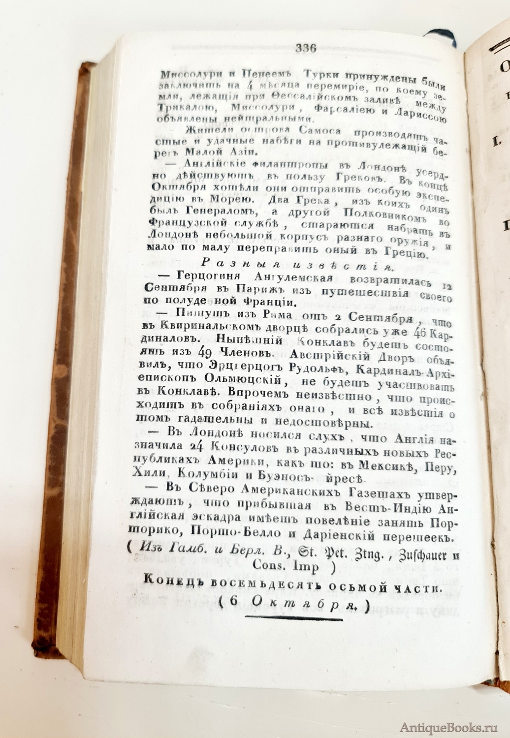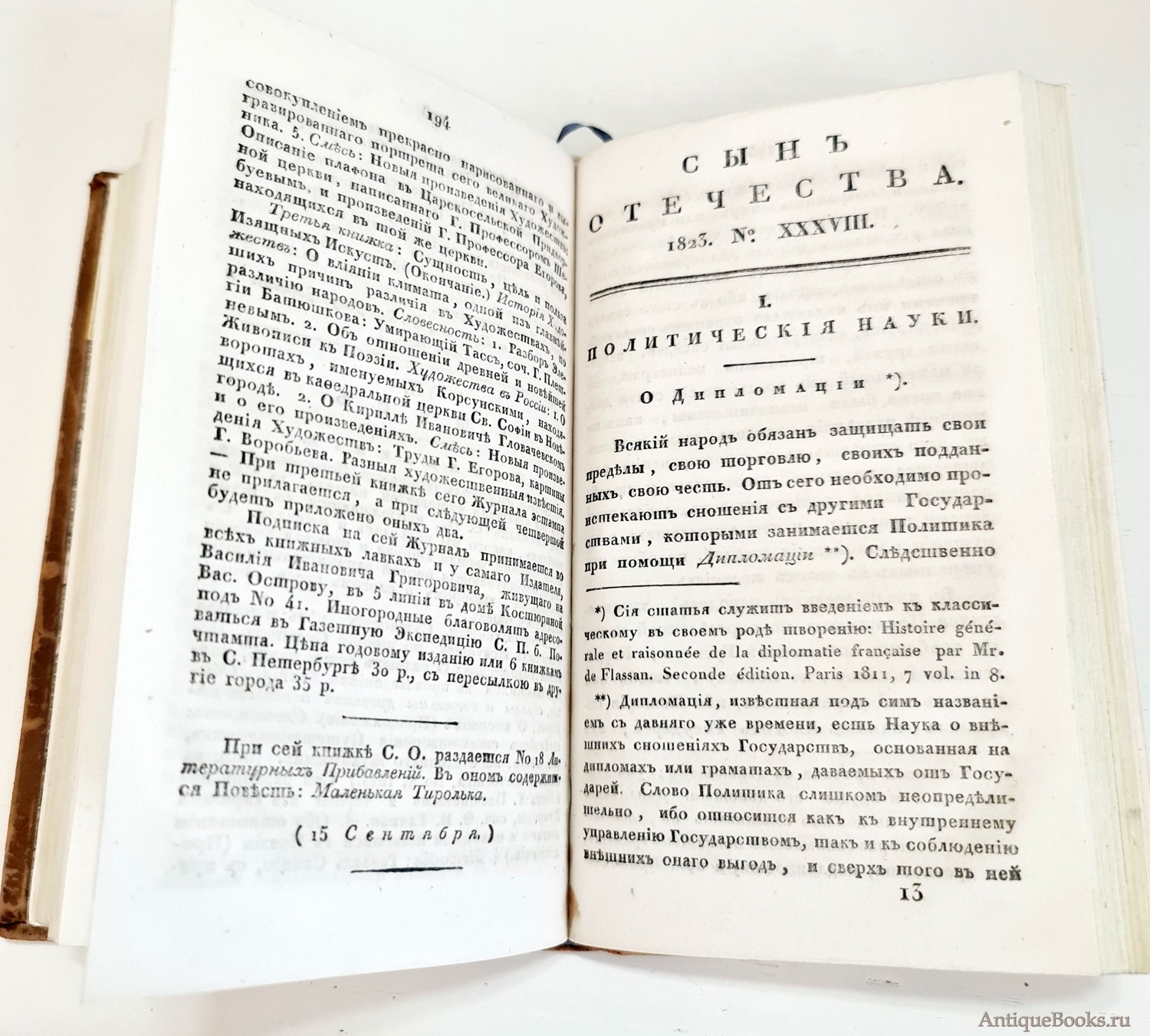 Экземпляр в цельнокожаном переплете с тиснением золотой рамочки по периметру. Из Аракчеевской библиотеке. С его знаменитым экслибрисом "Без лести предан". 338 стр. Формат 19х12,3х2,5 см. Состояние отличное. Исторический, политический и литературный журнал, издаваемый Гречем.