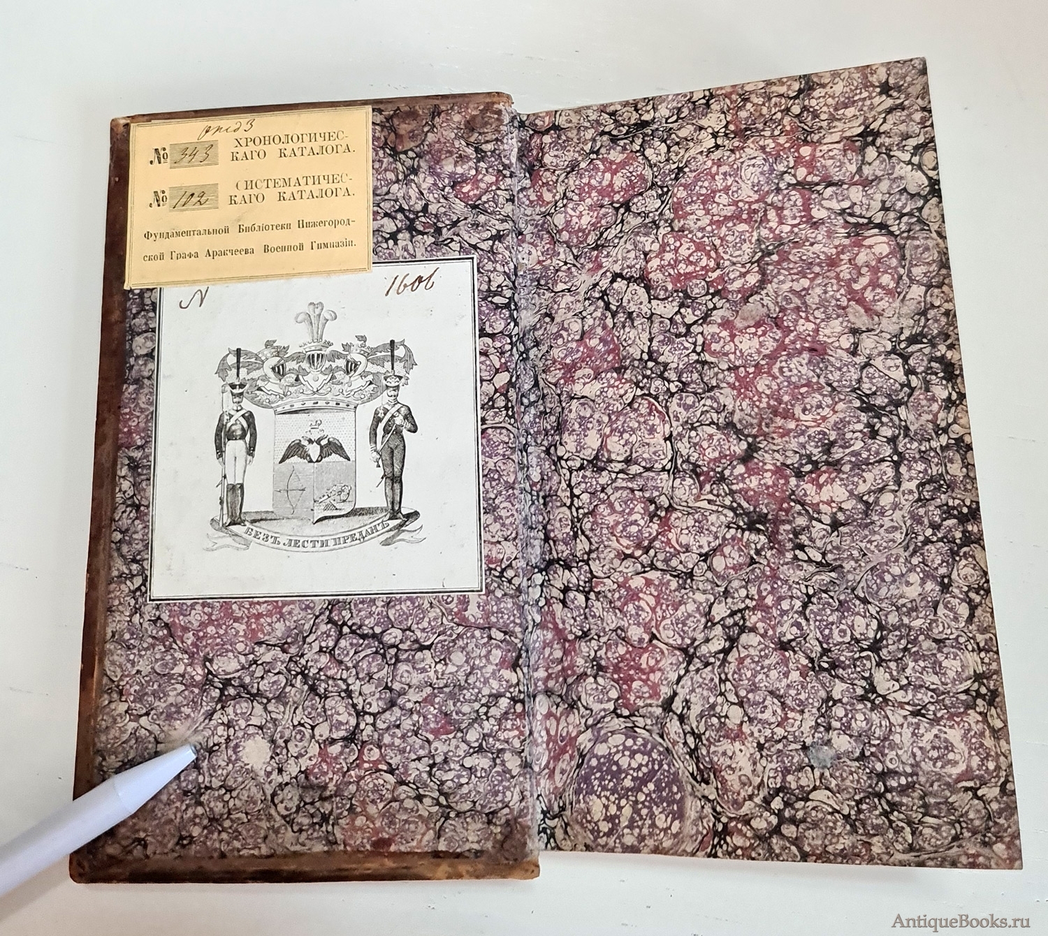 Экземпляр в цельнокожаном переплете с тиснением золотой рамочки по периметру. На форзаце имеется экслибрис из библиотеки Графа Аракчеева и "Без лести предан". 354 стр. Состояние отличное.