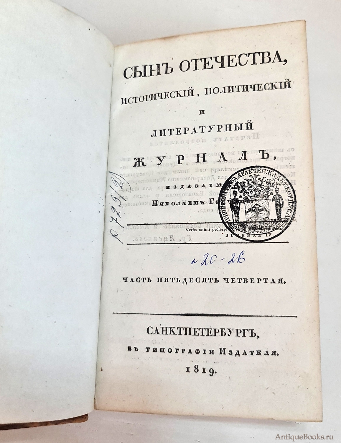 "Журнал "Сын Отечества". Часть 54" Санктпетербург, В Типографии Издателя, 1819 г.