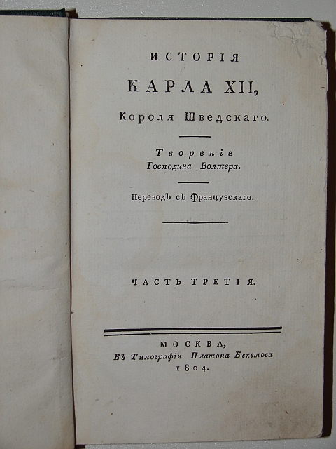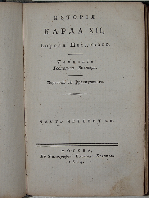 ВольтерТипография Платона Бекетова. Части III и IV в одном современном лидериновом переплёте. Часть III-157 стр., частьIV-169 стр.Фотографии издания "История Карла XII, Короля Шведского.". Вольтер. 1804г. Москва