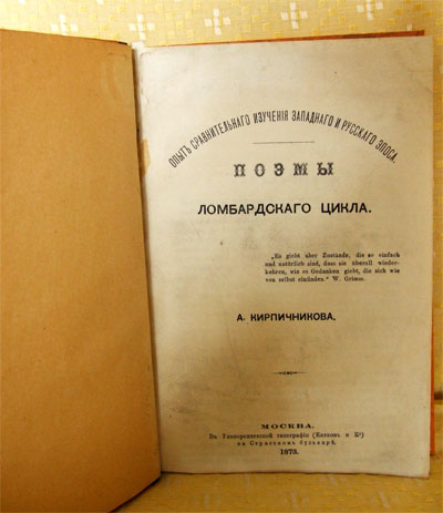 Представленный ниже экземпляр уже продан. Используйте поиск чтобы найти такую же или другую книгу Фотографии издания "Поэмы ломбардского цикла". А. Кирпичникова. Москва, 1873г.
